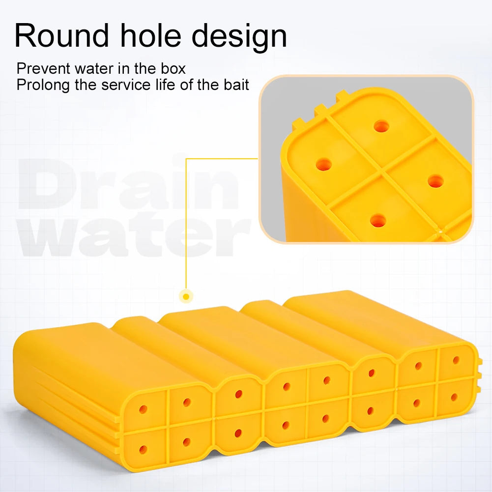 4. Water-Resistant Base: Designed with drainage holes, the base of the minnow squid jig hard bait container box prevents water buildup, helping to keep your bait dry and fresh, thereby extending its usability.