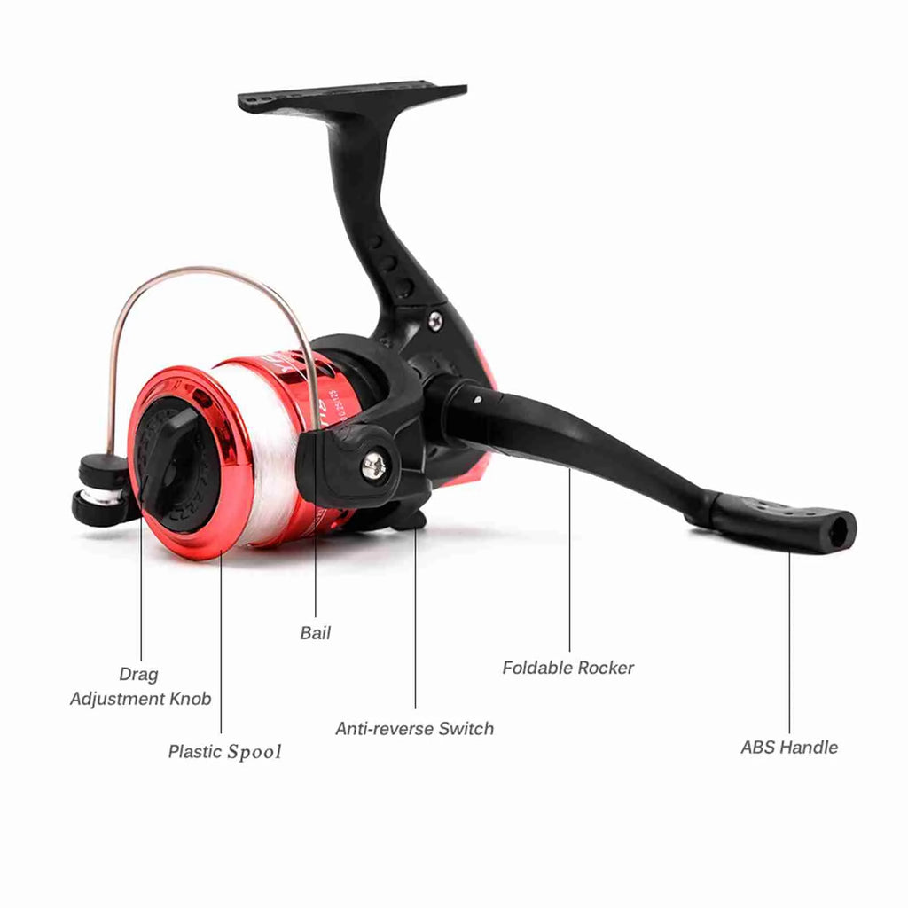 3. Fishing Reel: This deluxe spinning fishing reel is left and right hand interchangeable. It features durable metal spool, comfortable ABS folding handle and instant anti-reverse system. Line capacity (mm/m): 0.18/215, 0.20/175, 0.25/110.