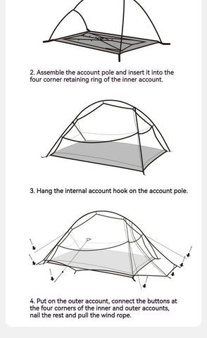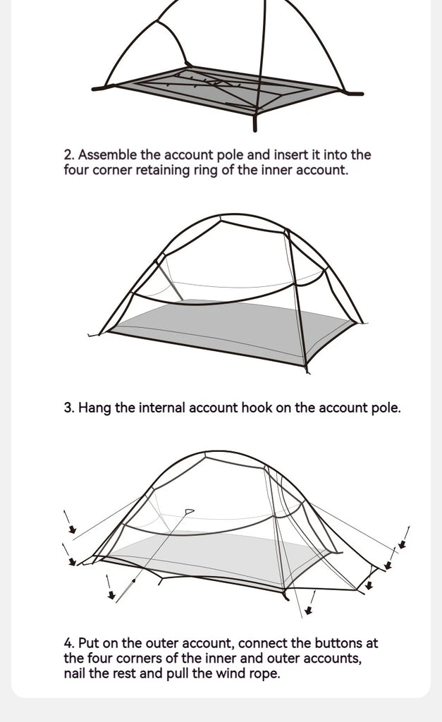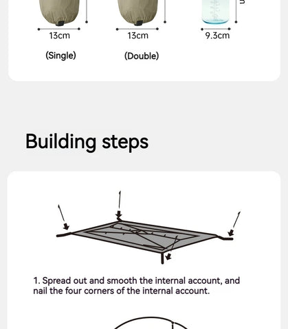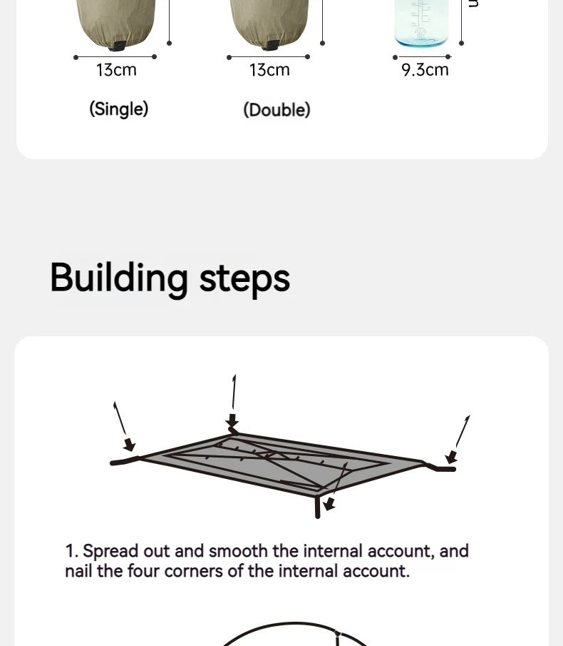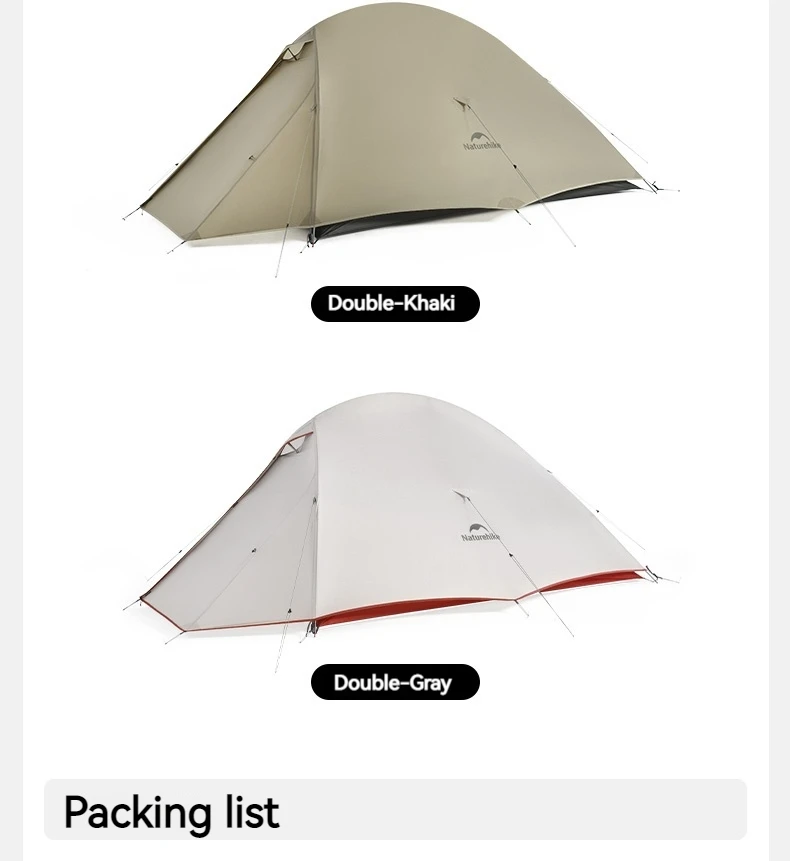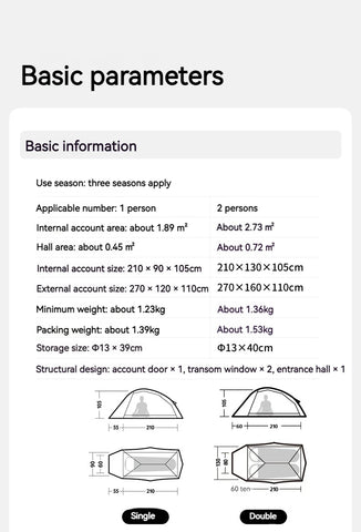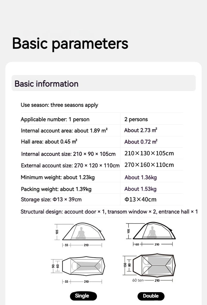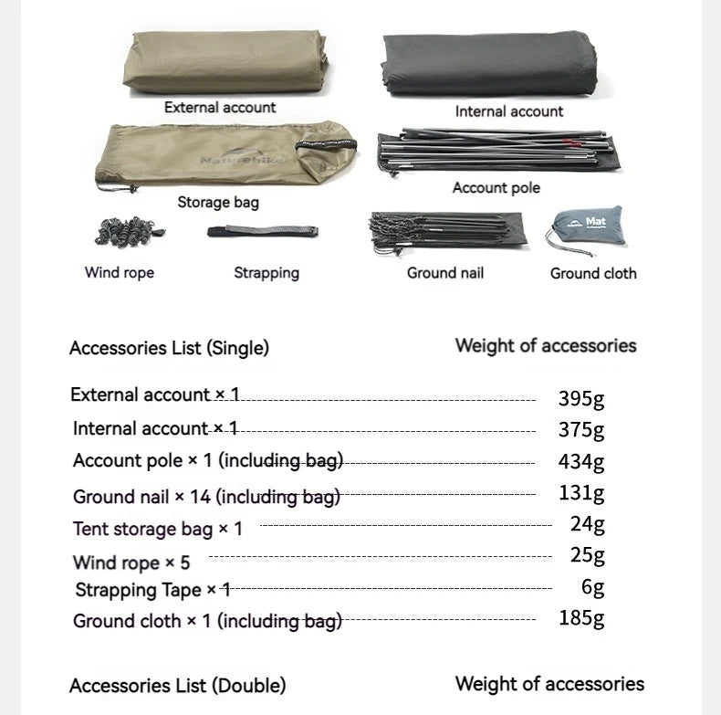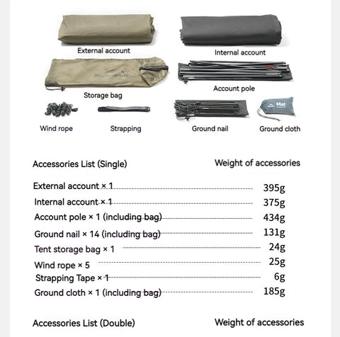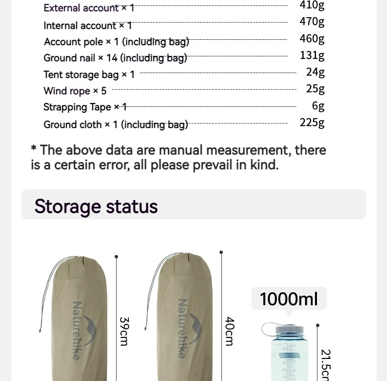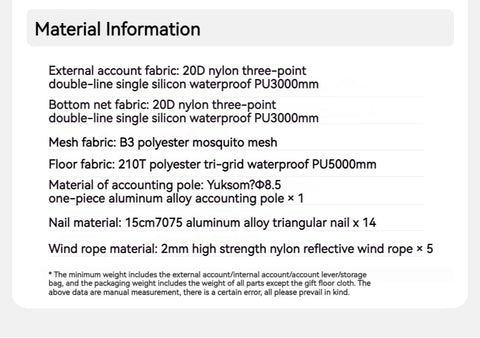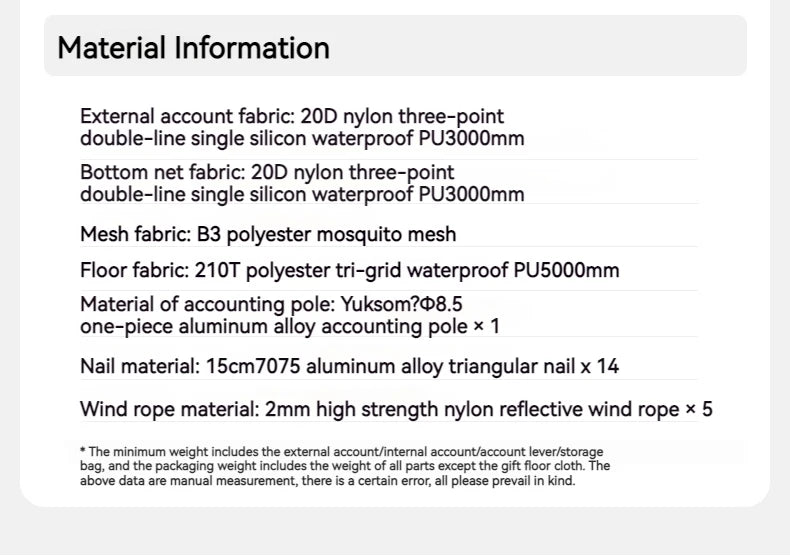 The minimum weight includes the flyer, inner tent, poles, and storage bag. The packaging weight includes all components, excluding the complimentary ground sheet. The above data is manually measured and may vary. Please refer to the actual product for accuracy.