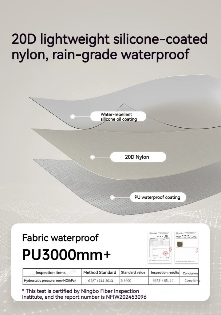 Bottom Fabric: 20D Nylon 3/4 Double-Grid Silicone Waterproof PU (3000mm+)