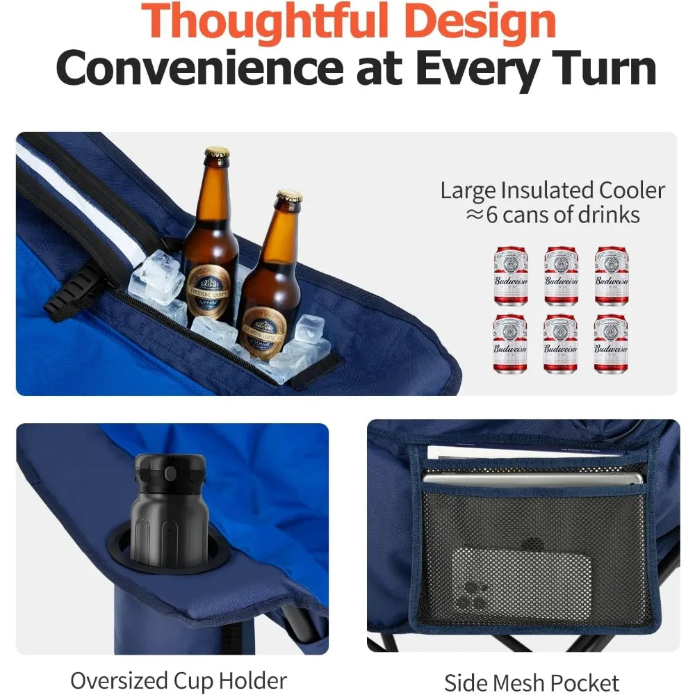 - Thoughtful Features for Convenience: Designed with the user in mind, camping chair includes an oversized cup holder that fits most beverage sizes and a large cooler bag for your favorite drinks. The side mesh pocket provides easy access to personal items, making it a versatile choice for comfy camping chairs for adults.